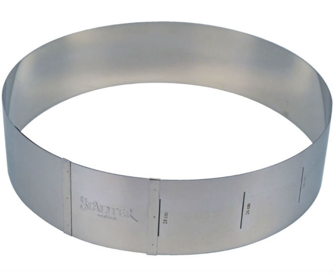 Die Größe ist verstellbar von Ø 18 cm bis Ø 30 cm. Mit einer Höhe von 10 cm lassen sich auch hohe Torten ganz einfach zubereiten.